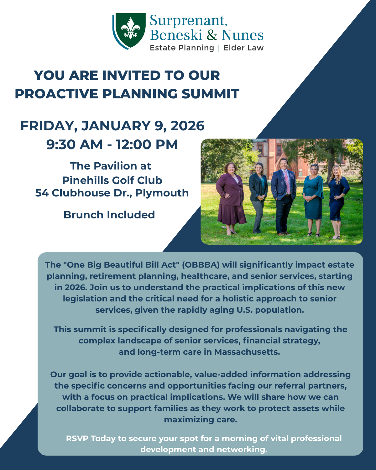 « All Events PROACTIVE PLANNING SUMMIT January 9, 2026 @ 9:30 am - 12:00 pm « Estate Planning 101 at the Wamsutta Club 5:30p-7p PROACTIVE PLANNING SUMMITFriday, January 9, 20269:30 am – 12:00 pm Event Registration CompanyThis field is for validation purposes and should be left unchanged.Name First Last Email PhoneAddress Street Address Address Line 2 City AlabamaAlaskaAmerican SamoaArizonaArkansasCaliforniaColoradoConnecticutDelawareDistrict of ColumbiaFloridaGeorgiaGuamHawaiiIdahoIllinoisIndianaIowaKansasKentuckyLouisianaMaineMarylandMassachusettsMichiganMinnesotaMississippiMissouriMontanaNebraskaNevadaNew HampshireNew JerseyNew MexicoNew YorkNorth CarolinaNorth DakotaNorthern Mariana IslandsOhioOklahomaOregonPennsylvaniaPuerto RicoRhode IslandSouth CarolinaSouth DakotaTennesseeTexasUtahU.S. Virgin IslandsVermontVirginiaWashingtonWest VirginiaWisconsinWyomingArmed Forces AmericasArmed Forces EuropeArmed Forces Pacific State ZIP Code Guest Info Add to calendar Google Calendar iCalendar Outlook 365 Outlook Live Details Date: January 9, 2026 Time: 9:30 am - 12:00 pm Event Category: Professional Partners Events Venue The Pavillion at Pinehills Golf Club 54 Clubhouse Dr. Plymouth, MA 02360 United States + Google Map