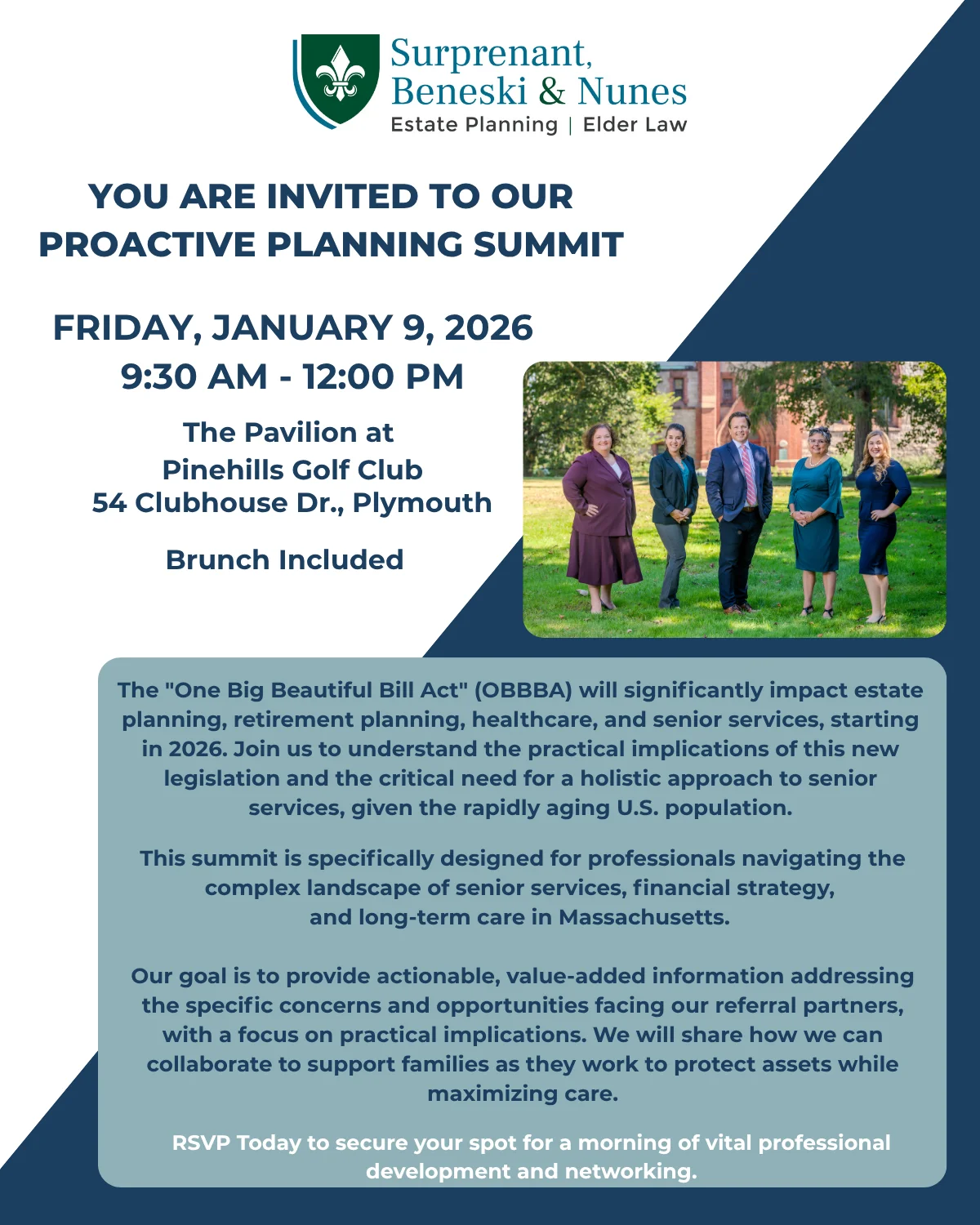 « All Events PROACTIVE PLANNING SUMMIT January 9, 2026 @ 9:30 am - 12:00 pm « Estate Planning 101 at the Wamsutta Club 5:30p-7p PROACTIVE PLANNING SUMMITFriday, January 9, 20269:30 am – 12:00 pm Add to calendar Google Calendar iCalendar Outlook 365 Outlook Live Details Date: January 9, 2026 Time: 9:30 am - 12:00 pm Event Category: Professional Partners Events Venue The Pavillion at Pinehills Golf Club 54 Clubhouse Dr. Plymouth, MA 02360 United States + Google Map